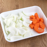 玉ねぎは8等分のくし形に切り、にんじんは1cm厚さのいちょう切りにします。